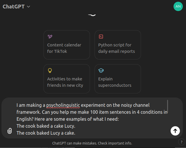 I am making a psycholinguistic experiment on the noisy channel framework. Can you help me make 100 item sentences in 4 conditions in English? Here are some examples of what I need: