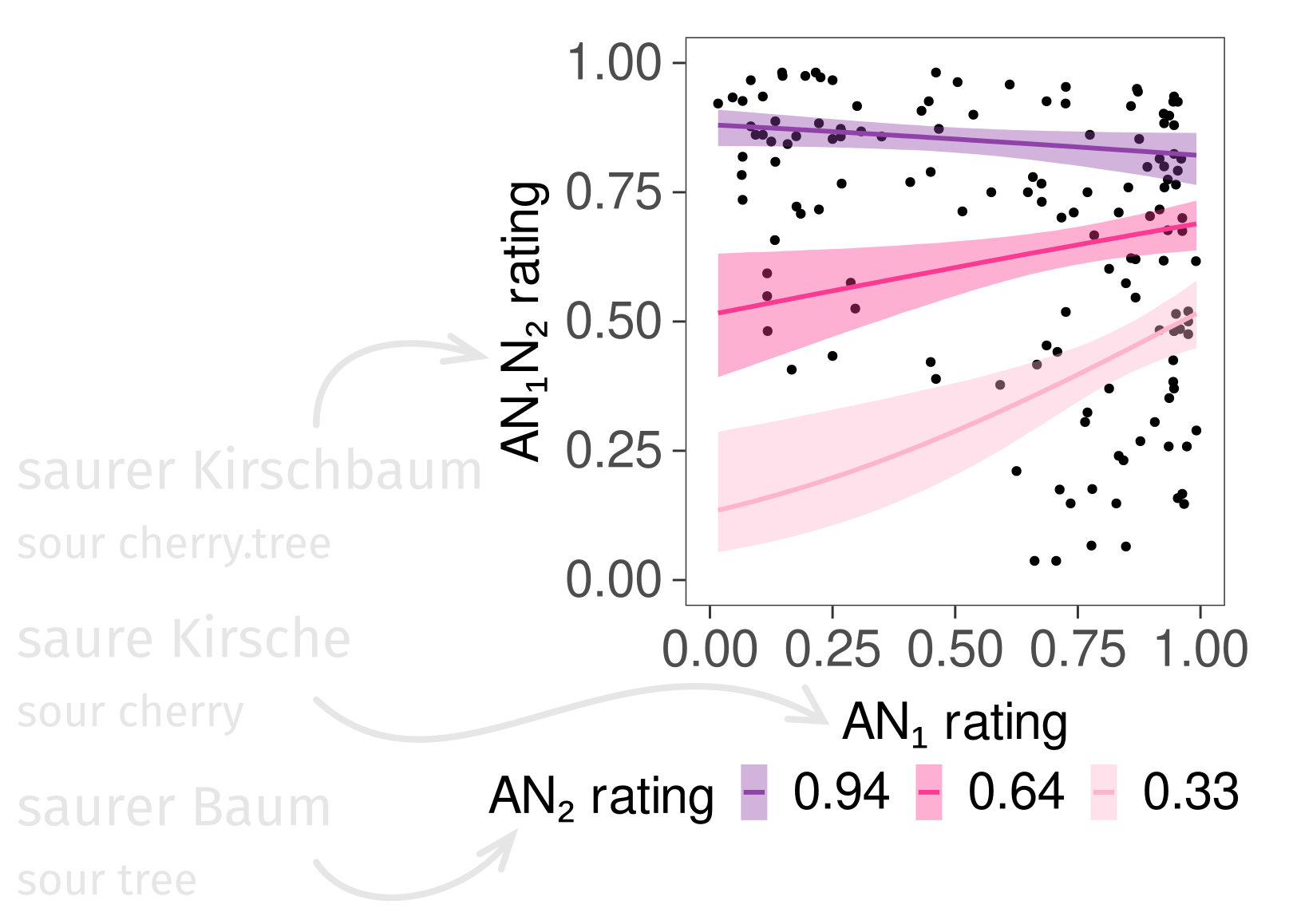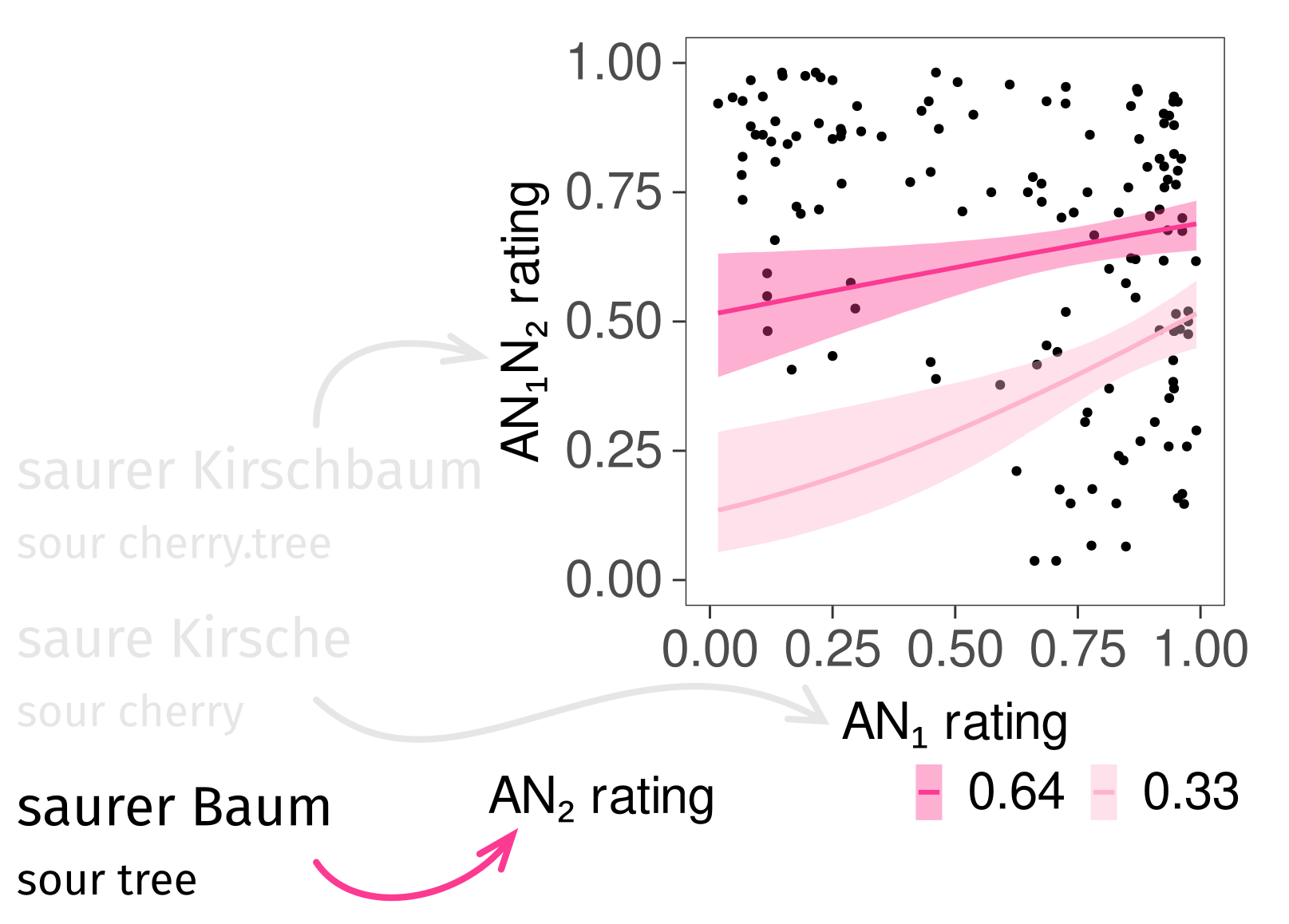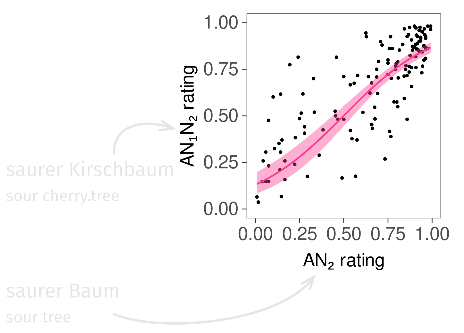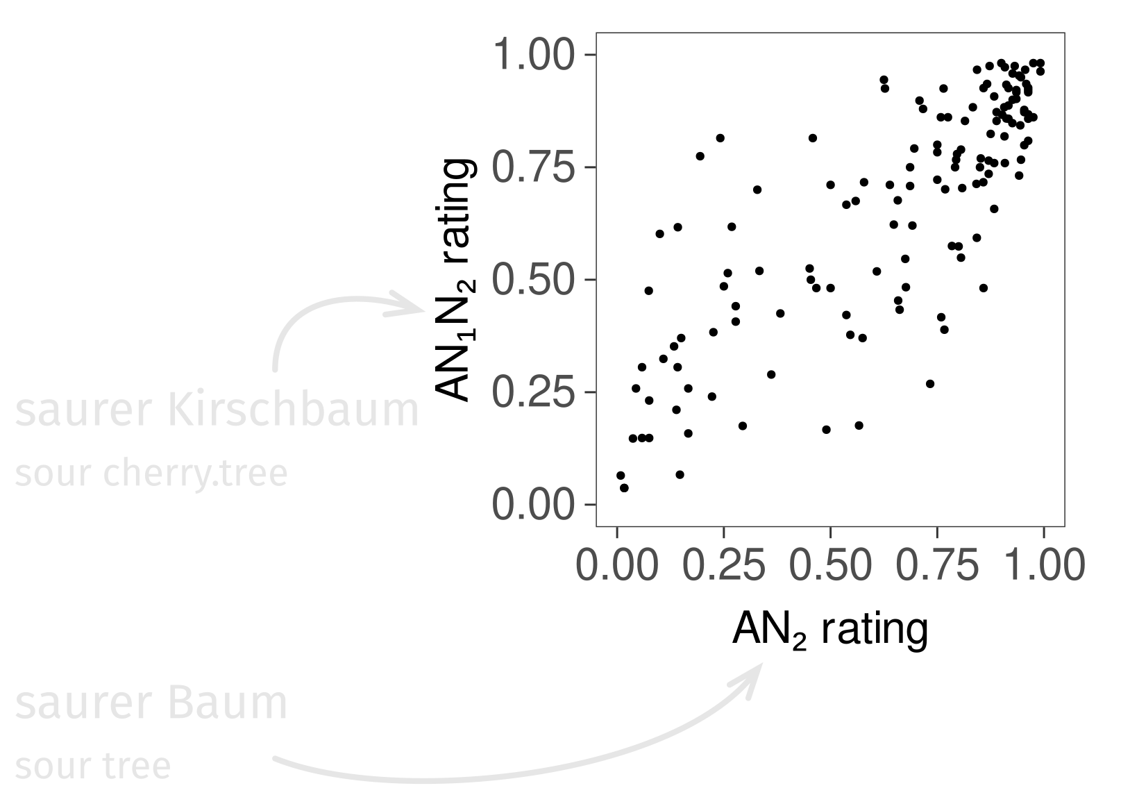 Strict grammaticality and compositionality: the ratings for the AN2 should be predicative of the AN1N2 rating.
