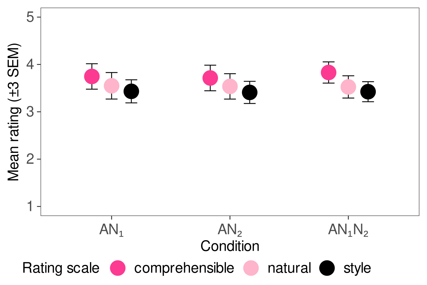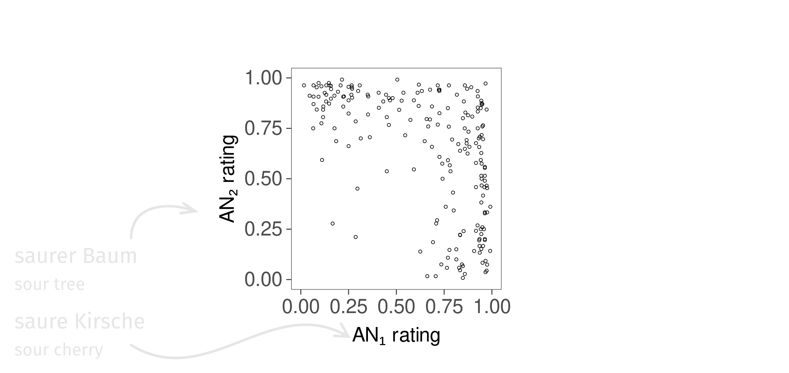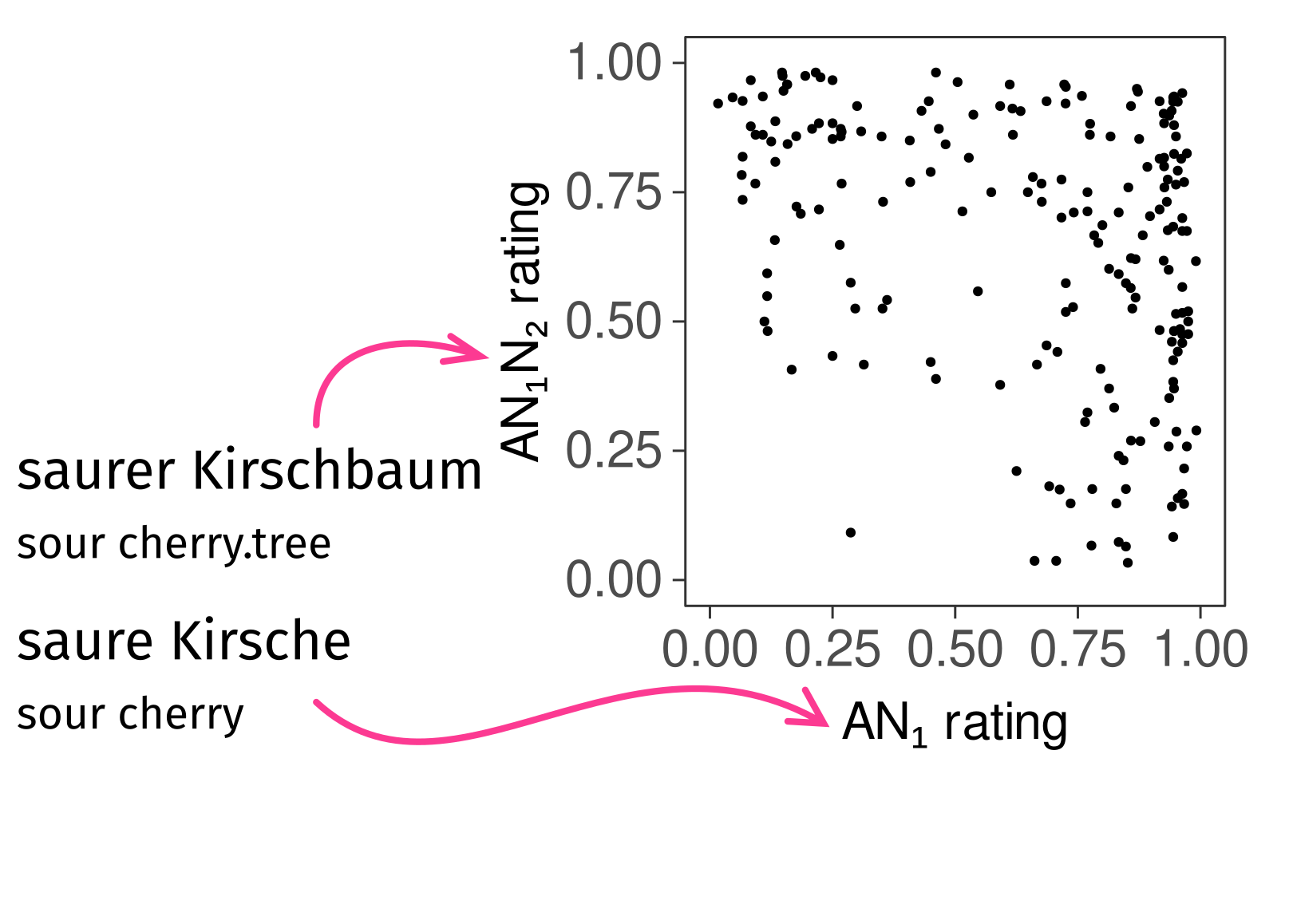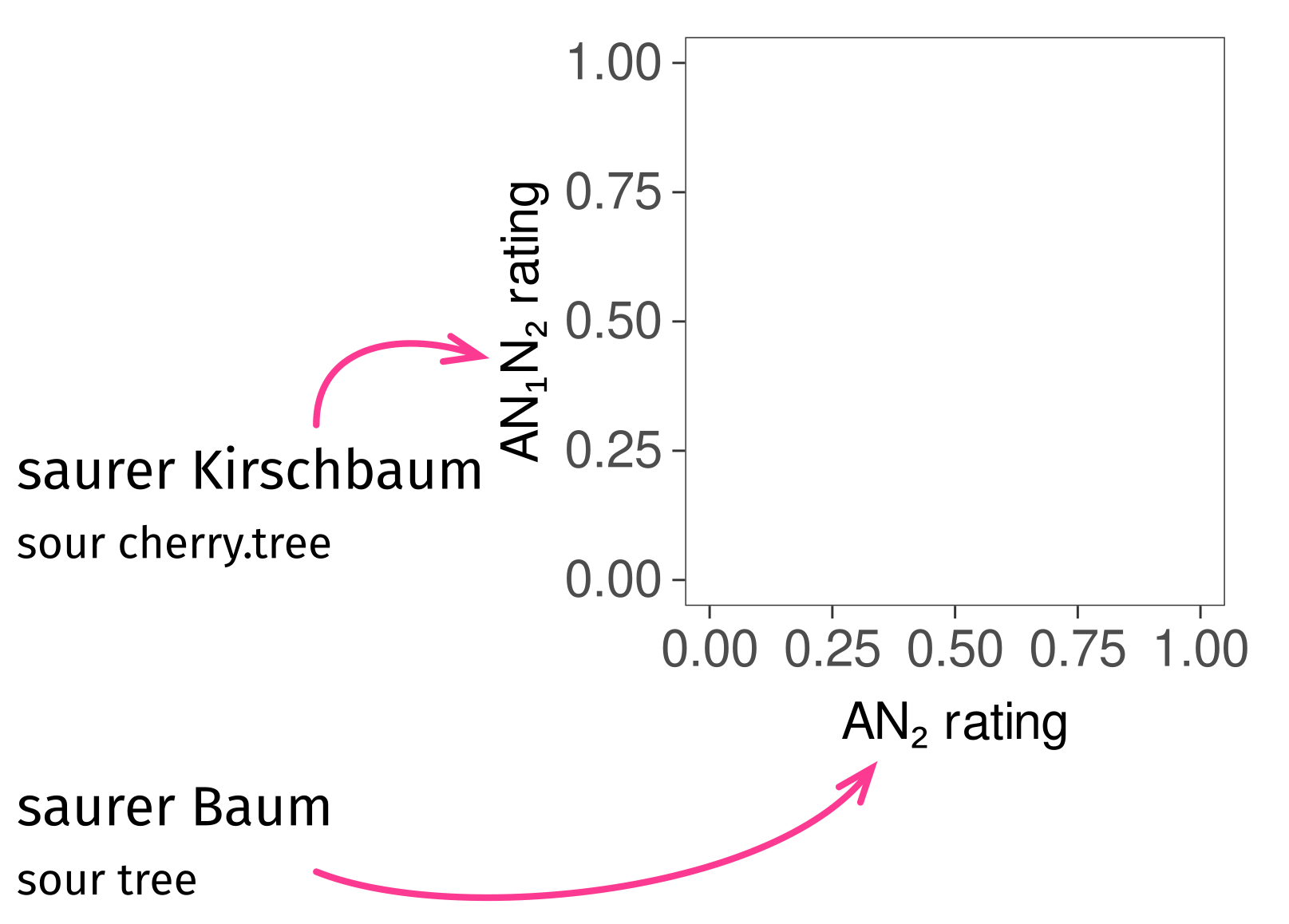 Strict grammaticality and compositionality: the ratings for the AN2 should be predicative of the AN1N2 rating.