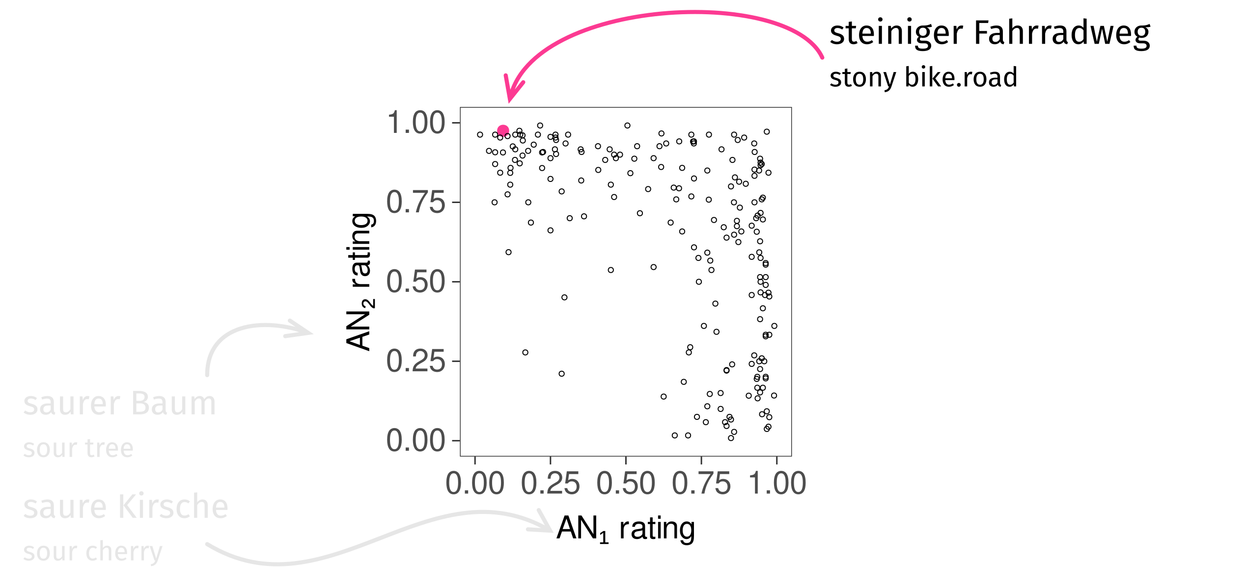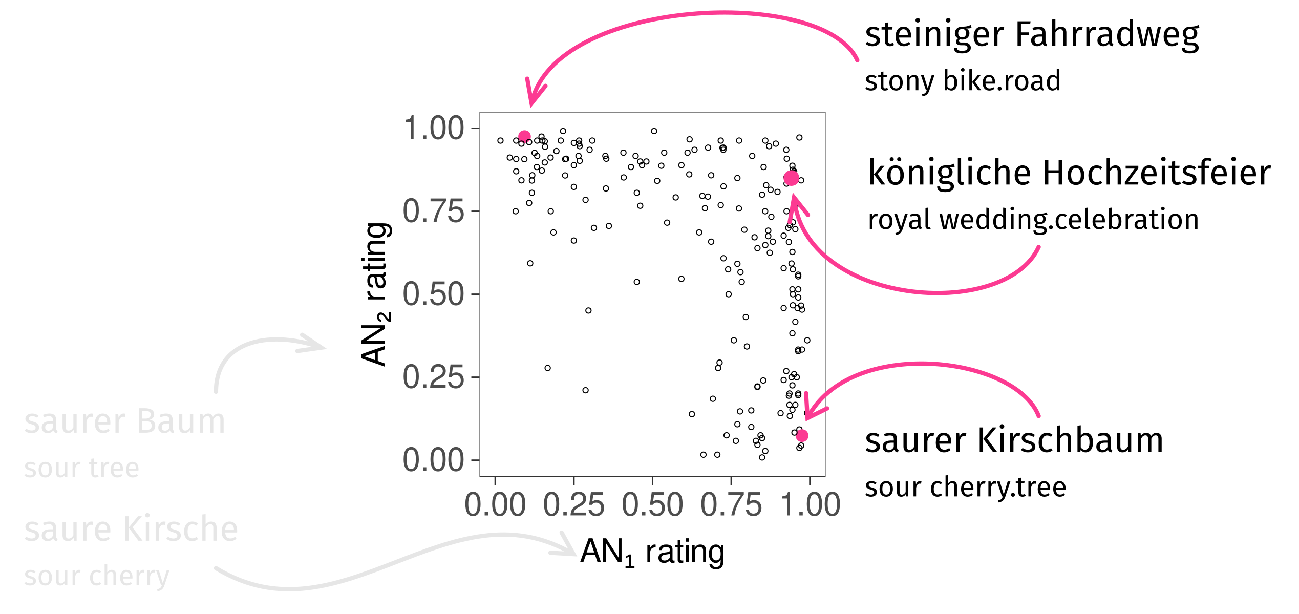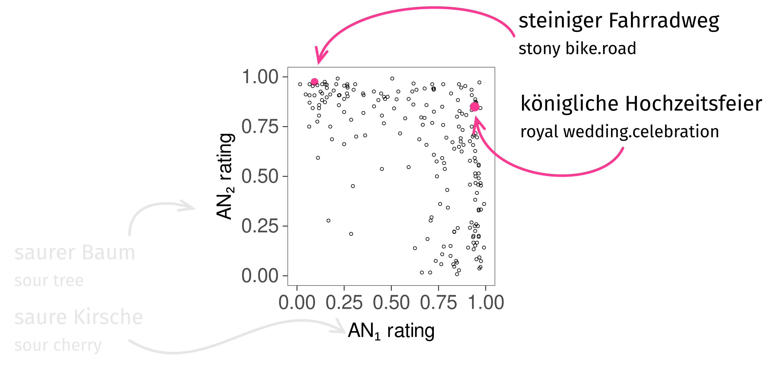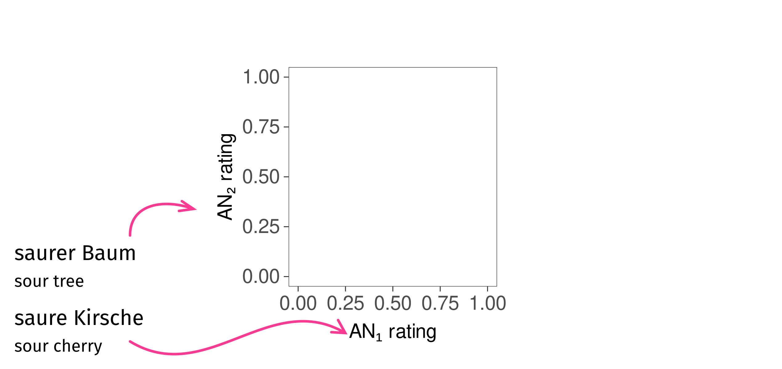 Strict grammaticality and compositionality: the ratings for the AN2 should be predicative of the AN1N2 rating.